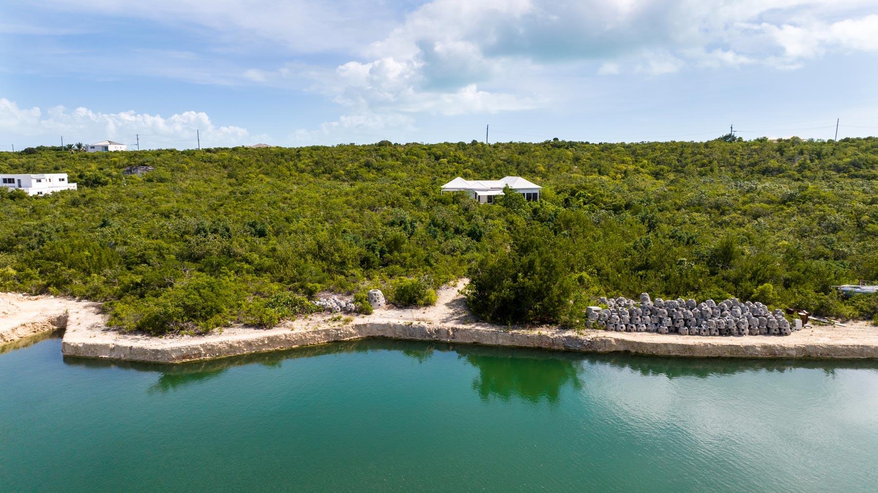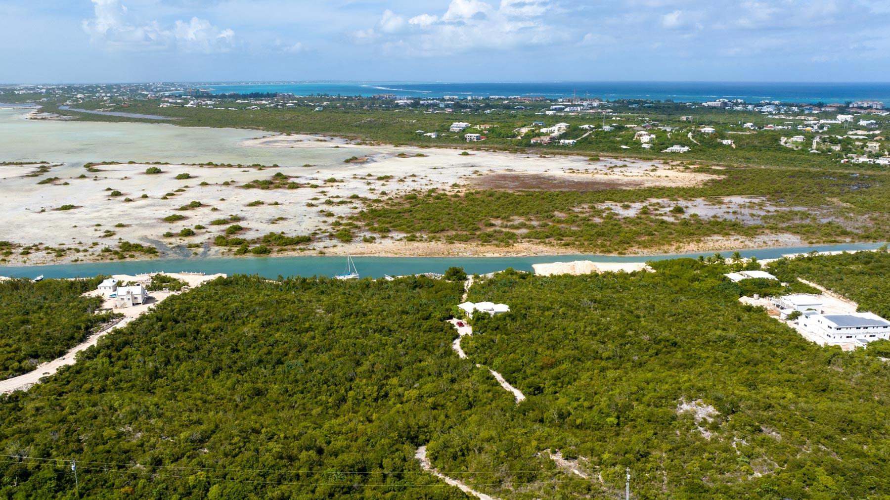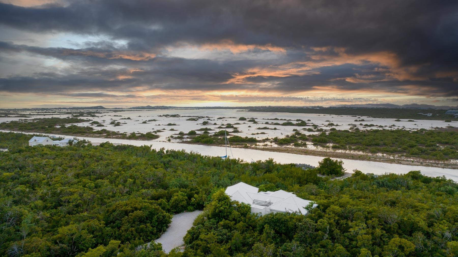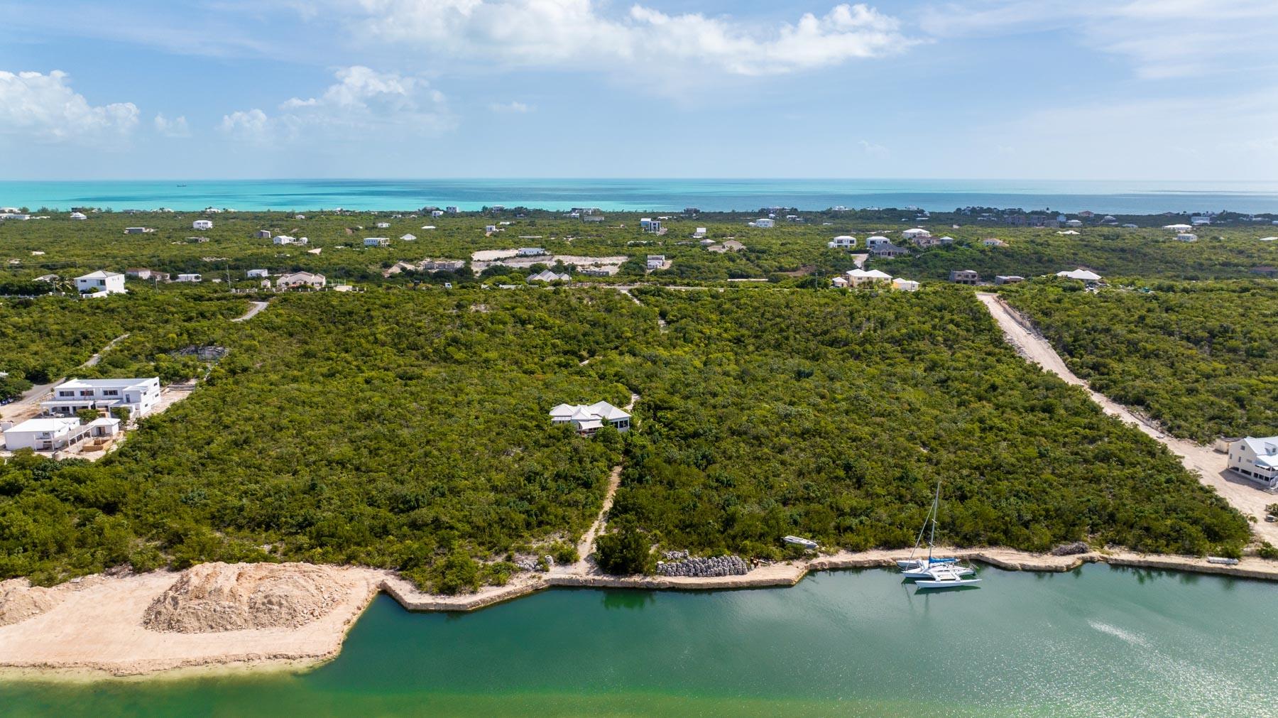 | Description | At 2.44 acres, this one-of-a-kind property slopes 60' in elevation from panoramic views abutting the newly paved Seasage Hill Road down to sea level and offers 145’ of Long Bay Canal frontage. A meandering concrete path driveway weaves through natural vegetation, fruit trees and thoughtfully selected, low maintenance flowering plants. This beautiful, architect designed 2-bedroom bungalow, was conceived in 2015 as a guest house that would eventually see a larger, main house to be built higher up the slope preserving 180° views of Juba Sound and Long Bay Canal. The bungalow is situated closer to the canal and also enjoys unobstructed views to the west where flamingos and other bird life frequently forage during the day, and stunning sunsets light up Juba Sound and the Canal below. The canal has recently been widened and deepened in this area and is perfect for swimming in the crystal clear water. The interior of the bungalow is an open plan with vaulted, open rafter ceilings and an inviting sunken living room area with screened windows on 3 sides and hand hewn native limestone flooring throughout. The open nature of the living area ensures cooling breezes throughout but is protected by power rolldown shutters for security, hurricane protection and breezy/rainy days. The kitchen is well proportioned and appointed with a central island and stainless-steel GE Profile refrigerator and stove. The primary bedroom is a calming space with a custom mahogany, four-poster king bed and custom woodwork. The second bedroom is set up as a dual-purpose office with custom built-in desk and shelving and a guest bed. A spacious bathroom boasts a large bathtub for 2, a bidet, and custom cabinetry. The outer decks and sitting areas surrounded by mature trees only add to the serenity of this special property. There are many possibilities for this property; whether to live in your own secluded bungalow while building a larger main house (existing plans are available) or potentially subdividing the acreage to create an enclave of Villas with canal access and a mere 7 minute drive to Grace Bay. The added benefit to this location is the canal access to the ocean through the newly developed South Bank Resort and Marina only a few minutes by boat to the south, perfect for lunch at Lua Restaurant or Sail Shades Pub. |