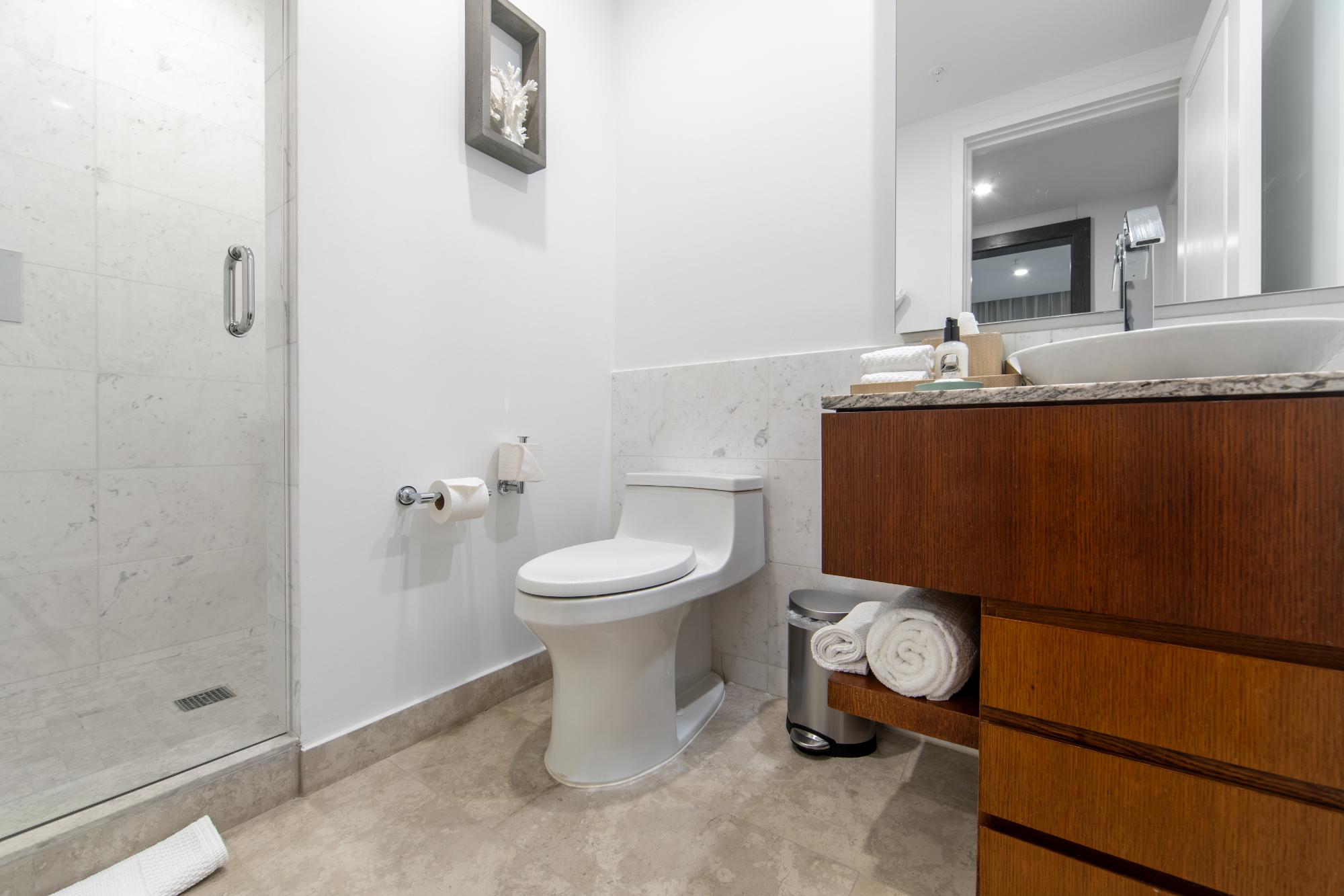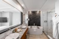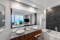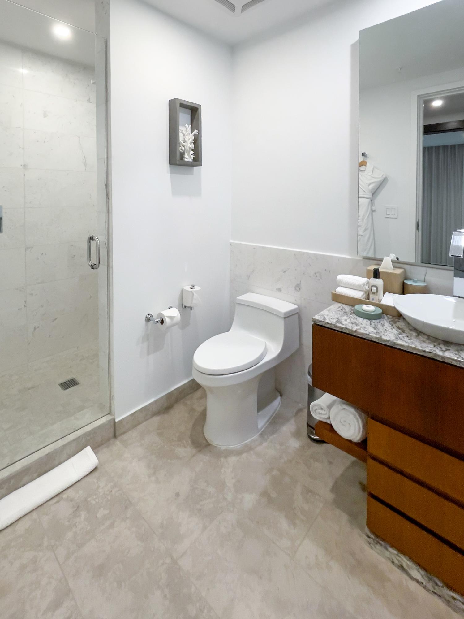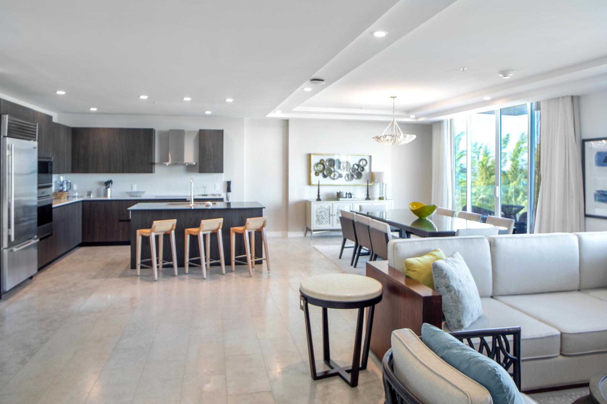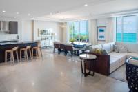 | Description | generous without exhibition, refined without stiffness. Sliding glass doors open fully, dissolving the boundary between interior air-conditioning and the Atlantic breeze — a practical luxury in the Caribbean, where comfort is measured as much by restraint as indulgence. The primary bedroom wakes to water. Light reflects upward from the sea and arrives softened, as though filtered through linen. The second bedroom, with twin beds and its own bath, makes the apartment equally suited to families or visiting friends — the sort of guests who extend a weekend and then, almost inevitably, reconsider their flights home. In the bathrooms, stone and glass replace ornament. A soaking tub faces a dark textured wall that recalls coral at low tide; the shower is generous enough to feel less like a necessity than a return from the beach. Downstairs, the rhythms of the resort continue |